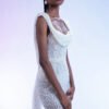The dress features a unique, asymmetrical cowl neckline that drapes elegantly over one shoulder.
