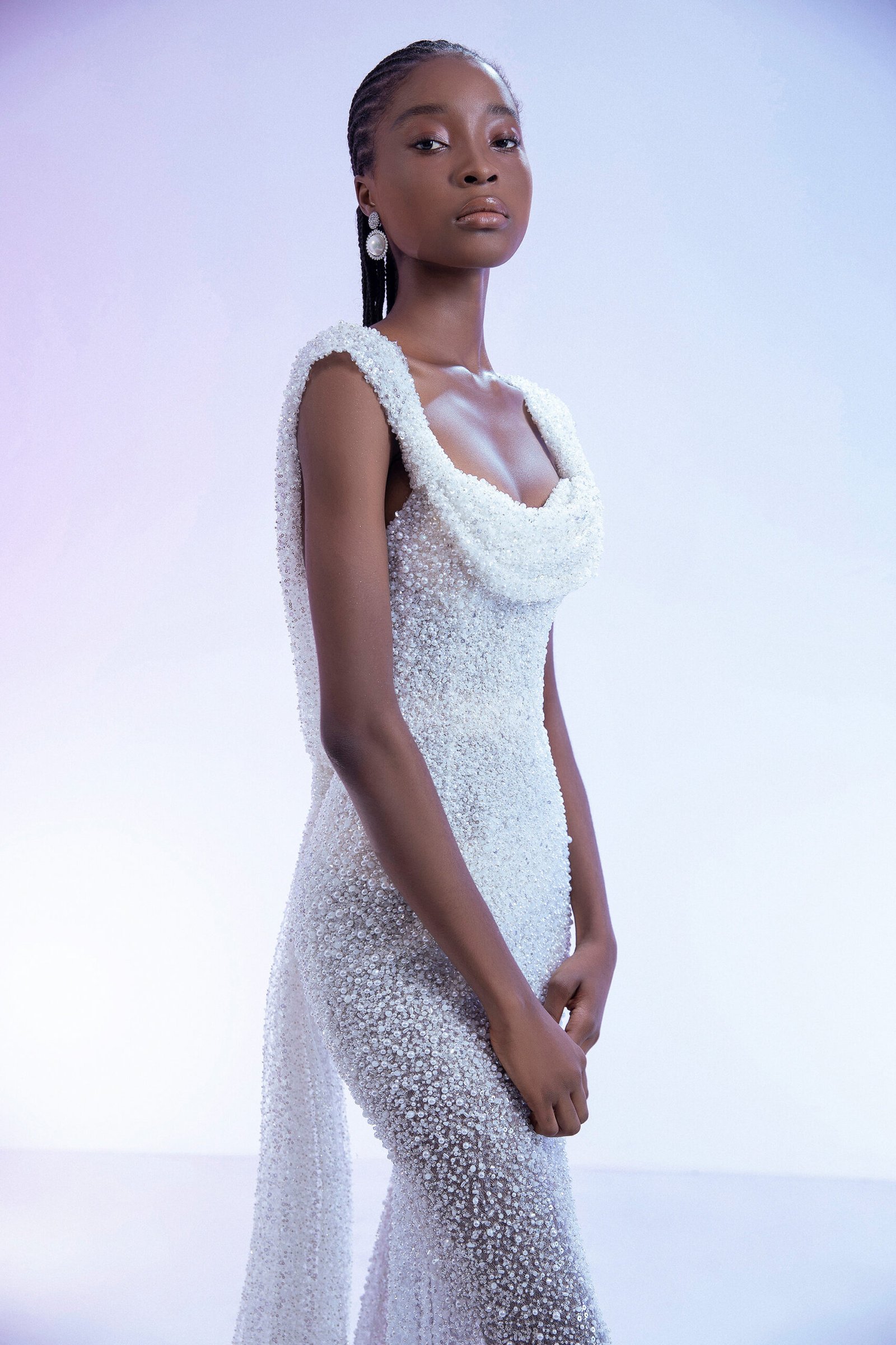 Be the first to review “Asymmetrical Cowl Neck White Mermaid Gown with Full Embellishments”