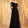 This dramatic black gown is a captivating blend of edgy and elegant. The strapless bodice features a corset leather. The dress is crafted from delicate black tulle, creating a layered effect. The flowing, ethereal layers of tulle add a soft, romantic contrast to the bold, beaded bodice.