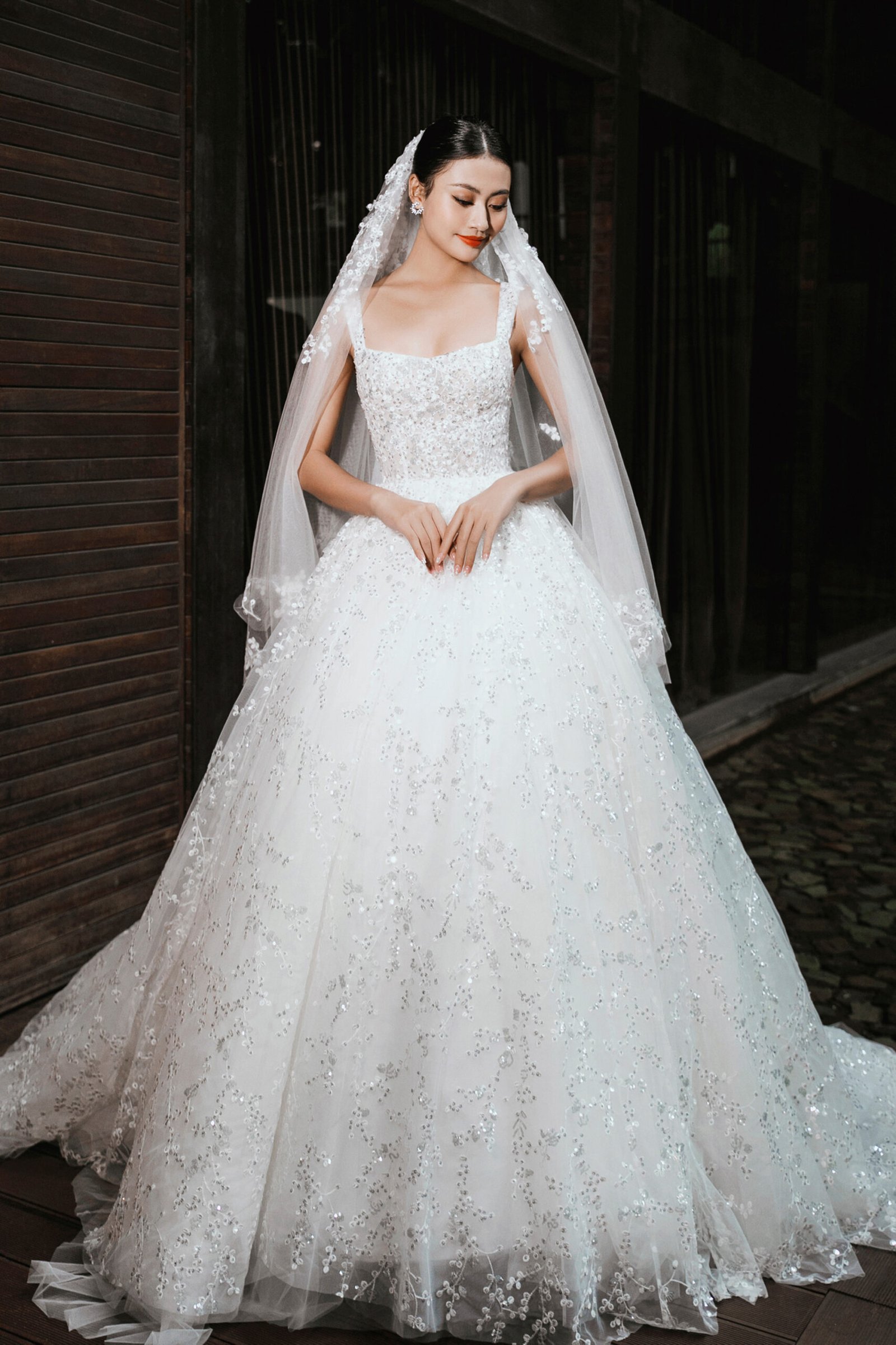 This wedding gown draws inspiration from the tana daisy a timeless symbol of purity and grace. Crafted from airy tulle in pristine white, it reflects the delicate charm of the flower itself. Hand-embroidered tana daisy motifs, adorned with meticulously placed sparkling crystals, add a subtle radiance, creating a look that is both ethereal and elegant, perfectly capturing the bride’s refined beauty.