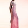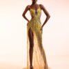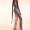 This exquisite gown is a true showstopper, adorned with intricate silver and gunmetal beading that creates a dazzling, cascading effect. The silhouette features a form-fitting bodice with a dramatic cut-out, delicate spaghetti straps, and a daring thigh-high slit. The meticulous beading flows down to create a fluid, shimmering texture, making it an ideal choice for a glamorous evening event.