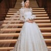 A timeless bridal gown designed in a graceful A-line silhouette that exudes effortless elegance. The highlight lies in the luxurious Chantilly lace overlay cascading from top to hem, creating a magnificent and refined look. Subtly puffed shoulders combined with a sharply tailored waistline enhance the structure of the gown, completing a modern yet sensual appearance for the bride.