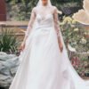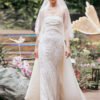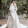 In an elegant white-cream hue, the gown features a graceful sweetheart neckline paired with a magnificent overskirt, evoking both sophistication and grandeur. The highlight lies in the masterful draping technique on the bodice, which adds depth and movement while accentuating the bride’s alluring silhouette in a refined fit & flare form.