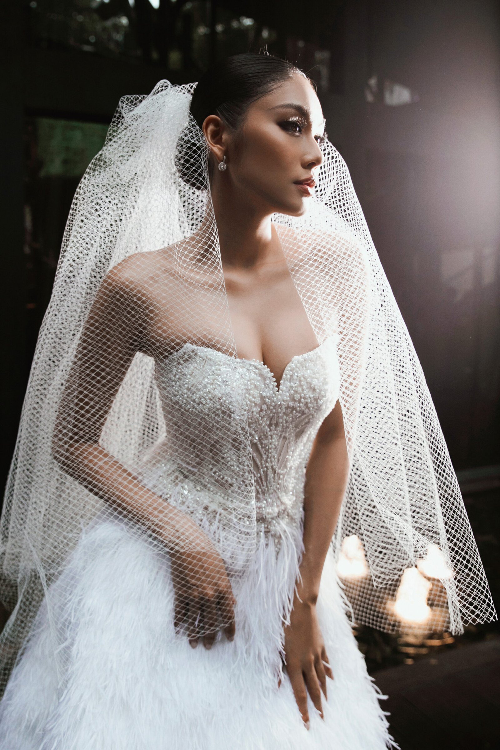 The design features a graceful Ball Gown silhouette with a soft sweetheart neckline, elegantly highlighting the delicate shoulders. The bodice is adorned with layers of premium, feather-light plumes, meticulously hand-applied with exceptional craftsmanship. Each movement evokes the image of petals drifting in the breeze, bringing a dreamy yet regal charm to the bride.